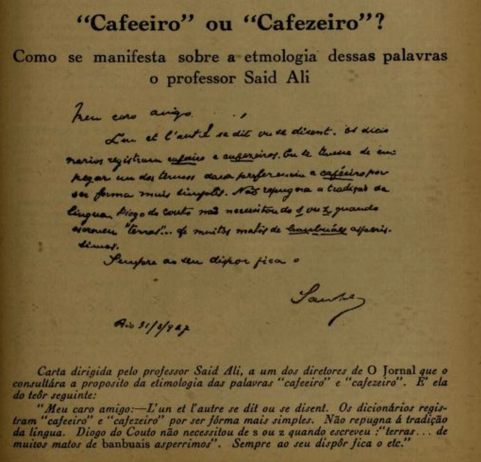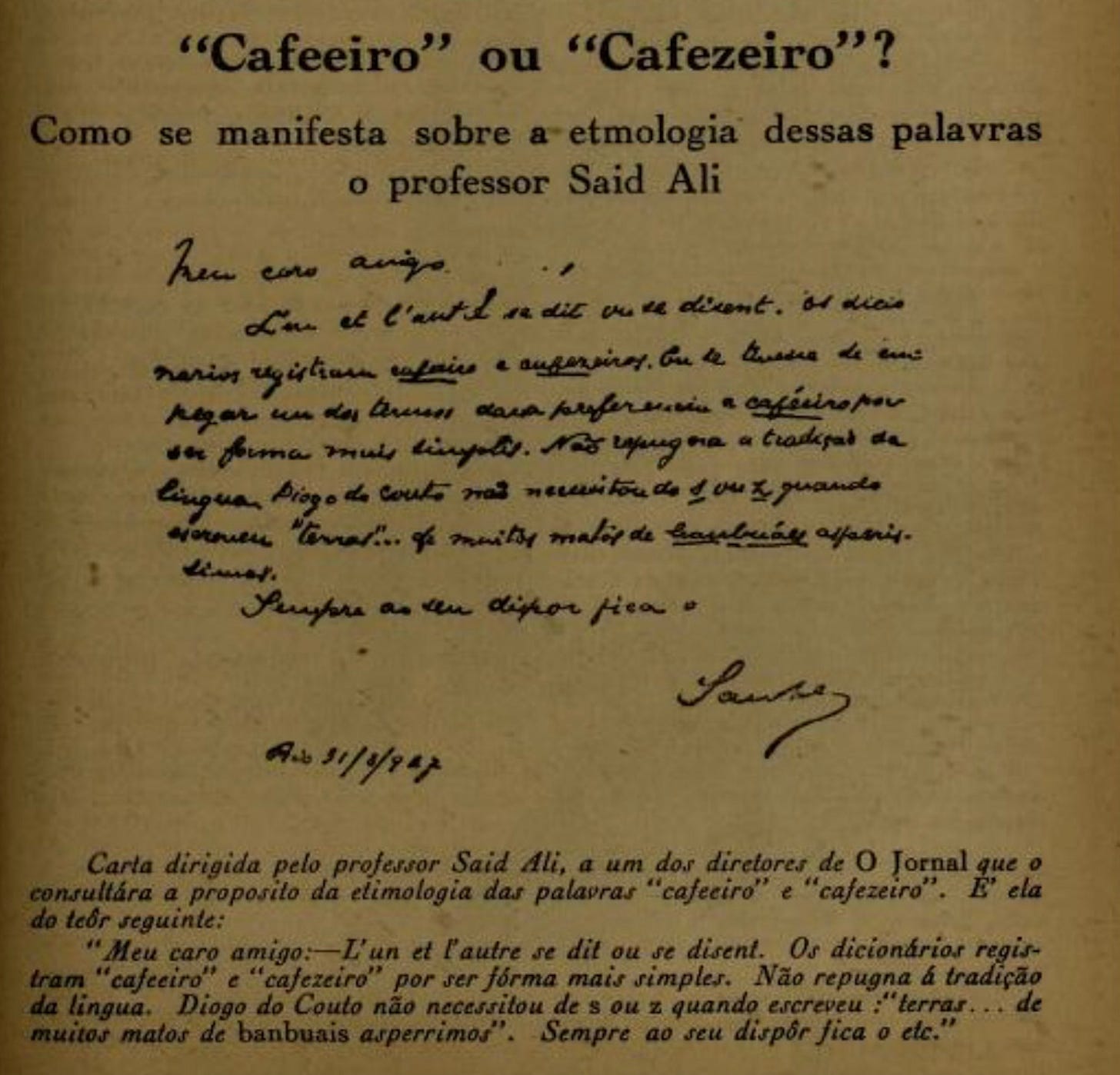 In the world of Brazilian coffee, even the name of the coffee plant is a curiosity. Both cafeeiro and cafezeiro refer to the coffee plant (Coffea), but what’s the difference? In the 1934 book O Café no segundo centenário de sua introdução no Brasil by the former Departamento Nacional do Café, a renowned Brazilian philologist named Manuel Said Ali Ida noted that both terms are valid, with cafeeiro favored for its simplicity, aligning with Portuguese’s flexible spelling tradition [1].