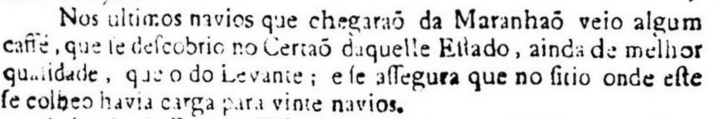 Four years later, in 1731, Portugal’s official government newspaper, Gazeta de Lisboa Ocidental, reported that coffee had come on the latest ships from Maranhão. It claimed the coffee was superior to that of the eastern Mediterranean and noted that 20 ships' worth had been harvested in the region. This fact shows the eventual path that coffee would take as it initally spread throughout Brazil, from Grão Pará, to Maranhão, then Bahia and finally the Southeast in 1760.